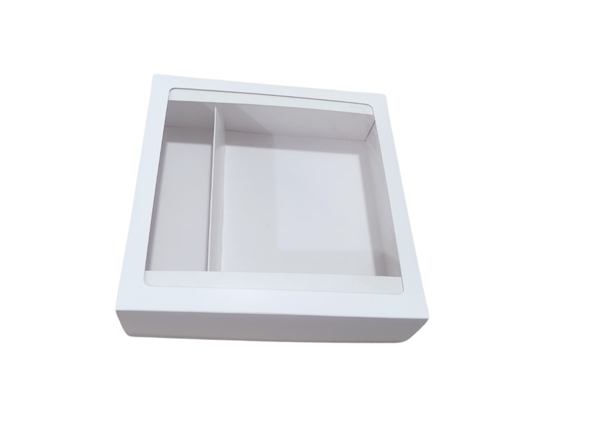 Această cutie albă din carton presat, cu dimensiunile 20x20x6 cm, este prevăzută cu capac și fereastră din acetofan transparent, perfectă pentru a pune în valoare produsele tale. Interiorul este compartimentat, ideal pentru prezentarea organizată a prăjiturilor, biscuiților, cadourilor mici sau produselor handmade.